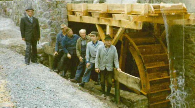Foto: Neubau des Mühlrades im Jahr 1986 Karl Thiele, Werner Schröder, Heinrich Büker, Werner Ridder, Siegfried Seidel und Wilhelm Lutter (von hinten nach vorne, Quelle: Heimat- und Verkehrsverein Elbrinxen)